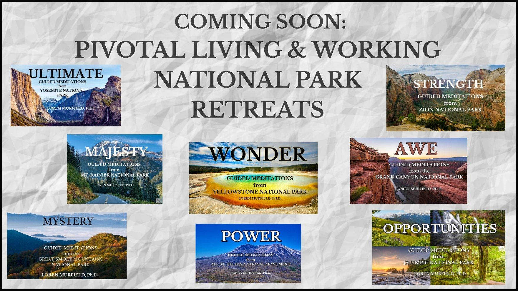 Join Dr. Murfield for a themed workshop in one the U.S.'s magnificent national parks. Dr. Murfield will lead you to your breakthrough based on the book he has written on that national park. Follow this site to be one of the first to learn about the destination and theme.